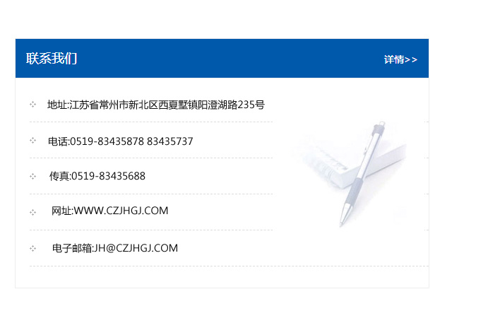 地址:常州市新北區友邦商務大廈1幢16、17層  電話:0519-85101652  傳真:0519-85112595  郵編:213022  網址:www.cz-jiayue_cn.jwjrjd.com  郵箱:xiajifengaa@163.com